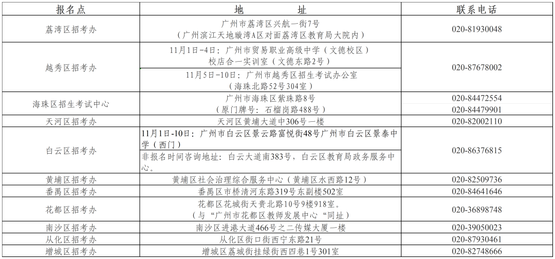 答:我市各区社会报名点的地址和联系方式见下表。